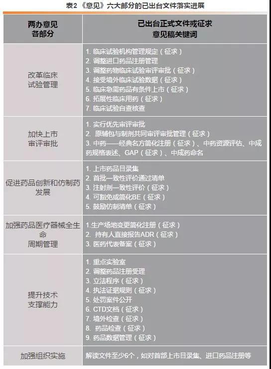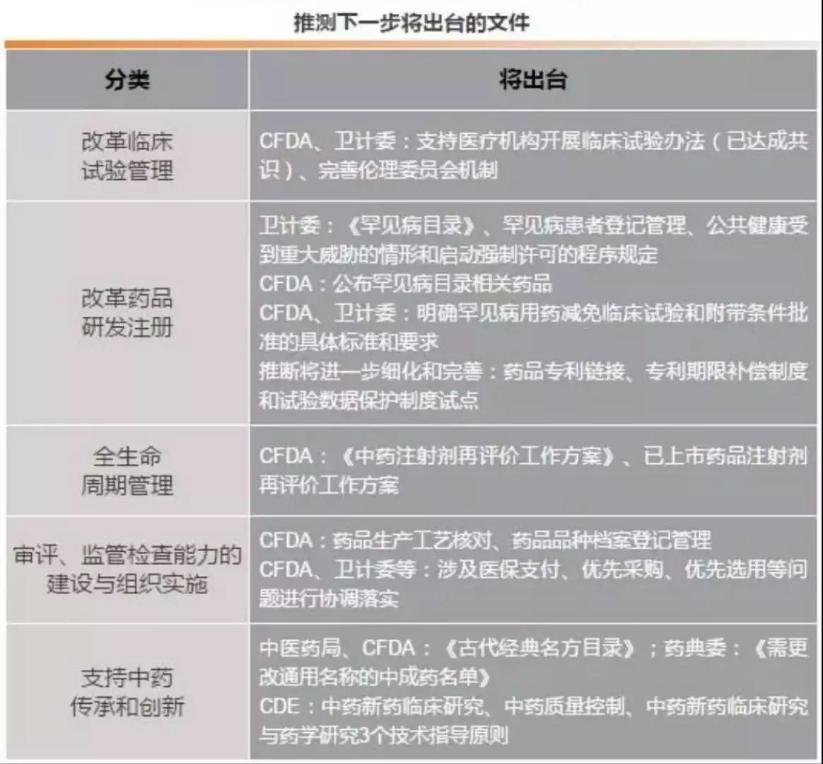 从《意见》要求,局领导对两办文件的答记者问、讲话等方面分析,下一步将出台的文件多是需要与其他部委协同。如与卫计委就罕见病、临床伦理,与中医药局就经典名方制定相关办法要求等。