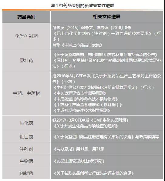 3、新政之下,所有药品将“被”参与改革。已上市的化药注射剂一致性评价;原料药与制剂的共同审评审批;中药经典名方简化注册、中药开展资源评估、规范中成药通用名命名、规格表述等;生化药将开展专项检查,进口药注册放开,注射剂严格审评审批,生物药类似药将单独分类,创新药的仿创平衡机制。