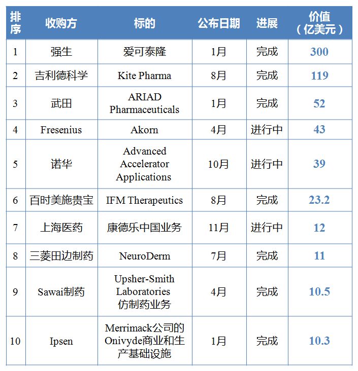 表2 2017年医药并购Top 10