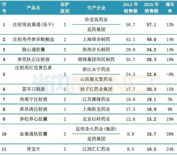注射用血塞通(冻干)居榜首,2016年销售额超过57亿