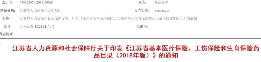 4月8日,江苏省人力资源社会保障厅发布:关于印发《江苏省基本医疗保险、工伤保险和生育保险药品目录(2018年版)》的通知。
