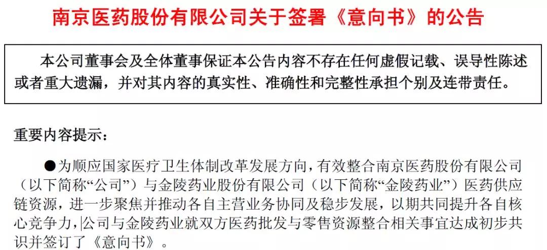 4月9日,南京医药股份有限公司(下简称南药)发布公告,宣布与金陵药业签署了《意向书》。