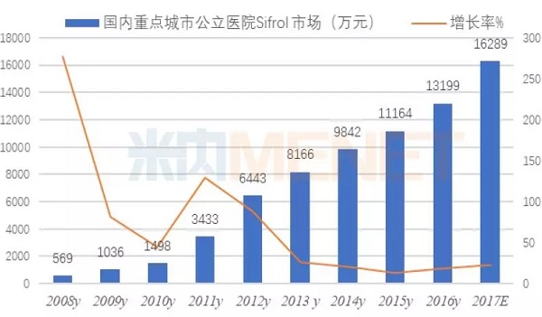 普拉克索为多巴胺激动剂,是2017《国家医保目录》中的药物,由德国勃林格殷格翰公司进口独家经营,商品名Sifrol(森福罗),2014年8月CFDA批准了普拉克索缓释片上市,进一步带动了市场增长。据米内网数据,2015年国内重点城市公立医院森福罗销售额已过亿元,2015~2017E国内重点城市公立医院森福罗市场为1.12亿元、1.32亿元和1.63亿元,年平均增长率为18.36%,普拉克索由原研药把持,国产药尚未面市。