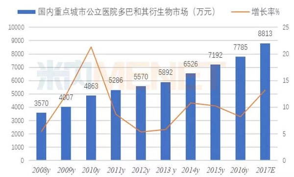据米内网数据,2015~2017E国内重点城市公立医院多巴及其衍生物系列市场为7192万元、7785万元、8813万元;年平均增长率为10.56%;其中多巴丝肼是这一类药物的领头羊,占据了八成的市场,而屈昔多巴是高速增长的品种。