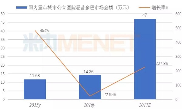 在国内,屈昔多巴是近年进入医院市场的药物,同样是中国PD市场高增长率的品种。据米内网数据,2015~2017E国内重点城市公立医院屈昔多巴11.68万元、14.36万元和47万元,2017E同比上一年增长率超过200%。