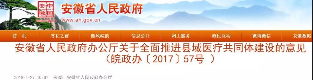 医药网5月2日讯 4月27日,安徽省政府官网发布《关于全面推进县域医疗共同体建设的意见》(下称意见)。《意见》显示,这份文件成文日期是2017年6月18日。