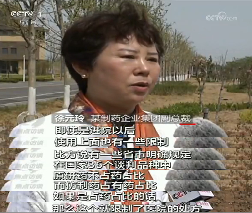 在“焦点访谈”中,有家药企的副总裁就表示,一些省市明确规定,在国家36个谈判品种中,原研药不占药占比、而仿制药占药占比,限制了医院的处方。