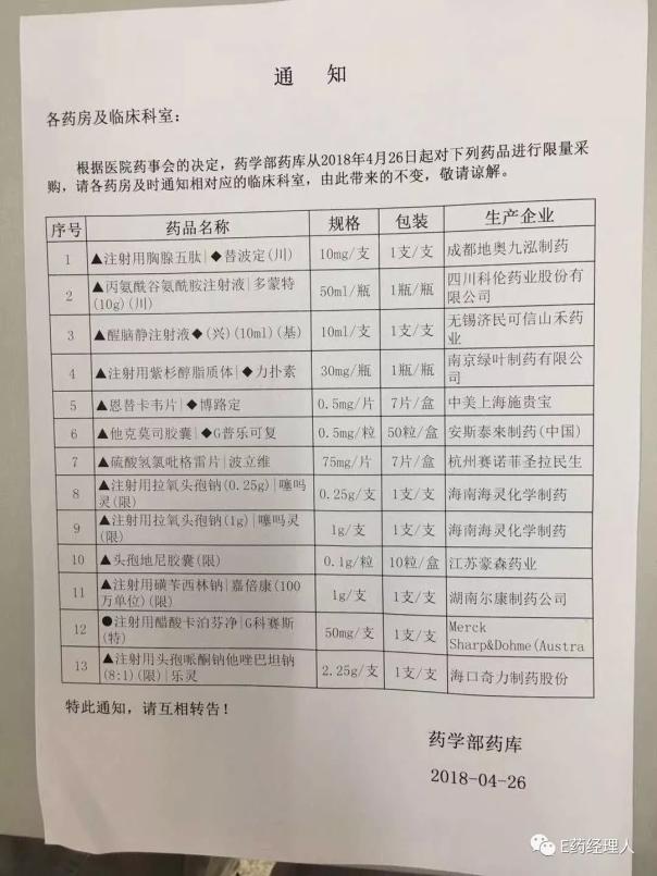 近日,医药朋友圈流出了这样一则消息:西南某医院药学部药库发布通知,自2018年4月26起,该院将对除湿止痒洗液、川黄口服液、慢肾宁合剂等20种药品不再购进,另外,对替波定、力扑素、波立维等13种药品进行限量采购。