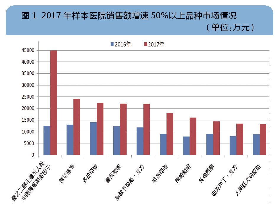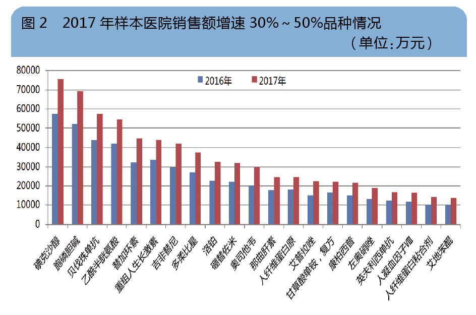 通过对样本医院通用名品种销售额增长率梳理分析发现,增速在20%~30%之间的品种有23个;增速在31%~50%之间的品种有21个;增速在50%以上的品种有10个。在2017年行业环境剧烈变化的情况下,这些产品依然保持强劲的增长态势,有力拉动了样本医院整体市场的增长,从另一层面也反映出当前国内样本医院核心产品竞争力情况。