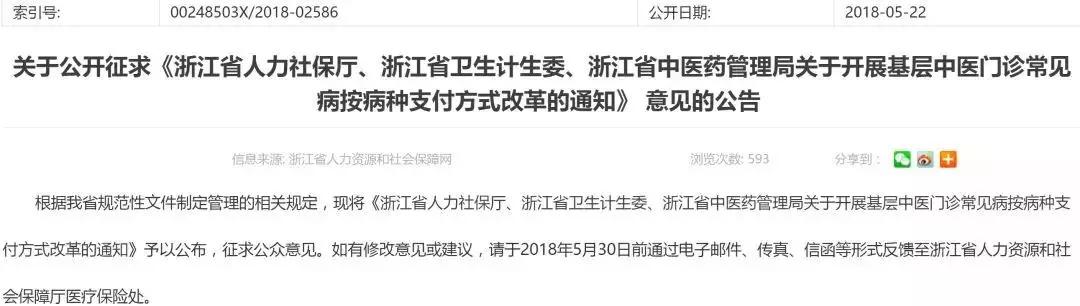5月22日,浙江省人社厅发布公告,就关于开展基层中医门诊常见病按病种支付方式改革向公众征求意见。