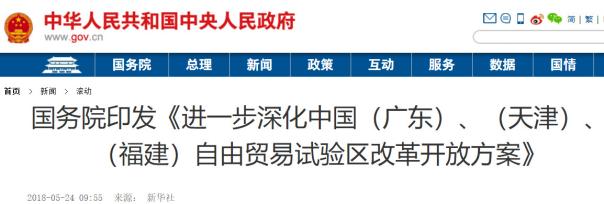 5月24日,国务院印发《进一步深化中国(广东)自由贸易试验区改革开放方案》、《进一步深化中国(天津)自由贸易试验区改革开放方案》、《进一步深化中国(福建)自由贸易试验区改革开放方案》。