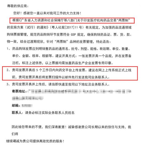 譬如,此前在广东医药圈就流传了一份商业公司发给药品生产企业的函。其中主要内容是根据广东两票制有关规定,加强药品流通领域购销票据管理的相关要求。