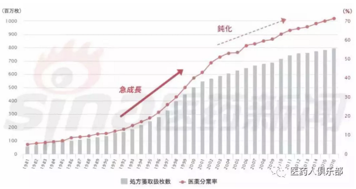 日本调剂药局接受的处方量与医药分业率