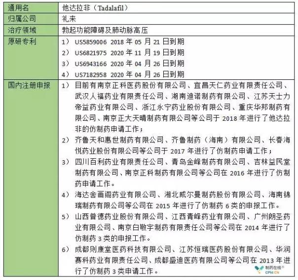 他达拉非是用于治疗ED的小分子药物/2017年销售额为23亿美元。通常情况下,小分子药物仿制门槛较低,这一点从国内申报注册情况可以看出,专利到期后仿制药的迅速跟进对销售额冲击较大。例如同类治疗领域的辉瑞的西地那非在专利到期之后,迅速的出现了仿制药上市的情况,销售额大幅下降。
