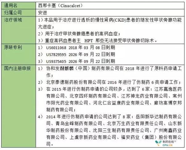 该药也是小分子化学药物,能激活甲状旁腺中的钙受体,从而降低甲状旁腺素(PTH)的分泌,销售额为15亿美元。