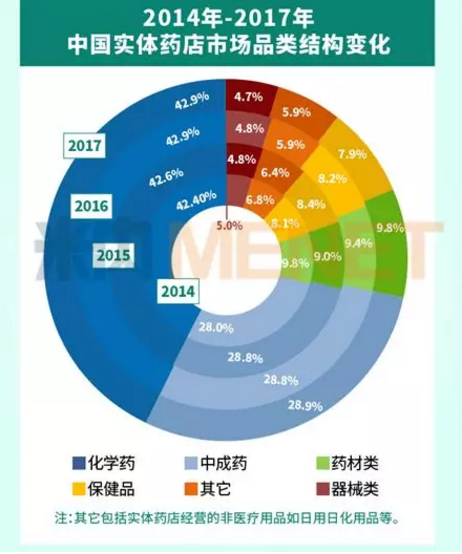 米内网数据显示, 2017年中国实体药店市场中,化学药的占42.9%,中成药占比在28.9%,药材类占比9.8%,保健品占比7.9%,器械类占比4.7%。在零售药店终端,药品占据的市场份额超过70%。