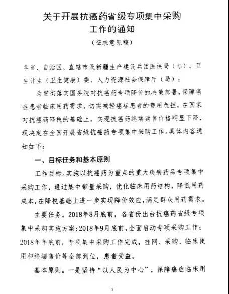随后,一份《关于开展抗癌药省级专项集中采购工作的通知》(征求意见稿)在业内流传。文件称:实施以抗癌药为重点的重大疾病药品专项集中采购工作,通过集中带量采购,优化临床用药结构,降低用药成本,在降税基础上进一步实现降价效应,满足群众用药需求;2018年8月底前,各省份出台抗癌药省级专项集中采购实施方案,2018年9月底前,全面启动专项采购工作,2018年年底前,专项集中采购工作完成。