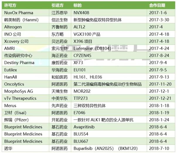 近年来中国药企研发和资金实力逐渐增强,在国家鼓励创新的政策引导下,国内企业越来越多地与跨国企业建立合作,通过专利许可、共享权益等方式引入国际创新研发项目。
