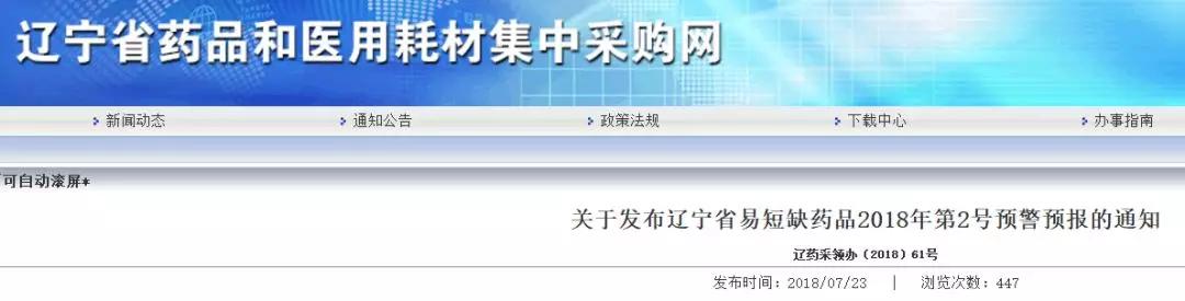 7月23日,辽宁省药品和医用耗材集中采购网发布《辽宁省易短缺药品2018年第2号预警预报的通知》。