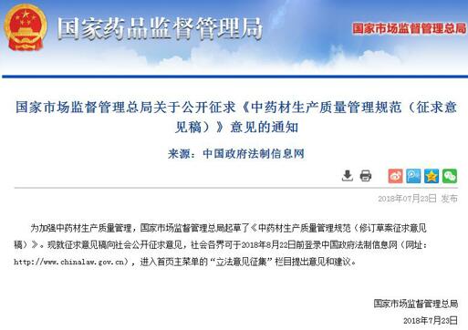 通知说,为加强中药材生产质量管理,国家市场监督管理总局起草了《中药材生产质量管理规范(修订草案征求意见稿)》。现就征求意见稿向社会公开征求意见,社会各界可于2018年8月22日前登录中国政府法制信息网, 进入首页主菜单的“立法意见征集”栏目提出意见和建议。