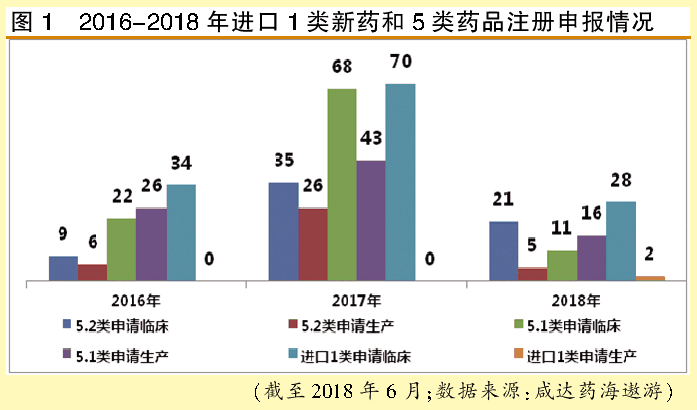咸达药海遨游数据显示,化学药品注册法规改革后,2017年以前进口注册申报还是以5.1类临床申报和1类新药临床申报为主,2018年上半年5.2类的临床申报有所上升。