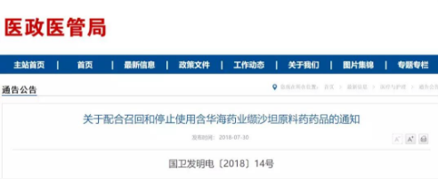 昨日(7月30日),卫健委发布《关于配合召回和停止使用含华海药业缬沙坦原料药药品的通知》,要求各级各类医疗机构禁用涉及召回的含华海药业缬沙坦原料药药品。