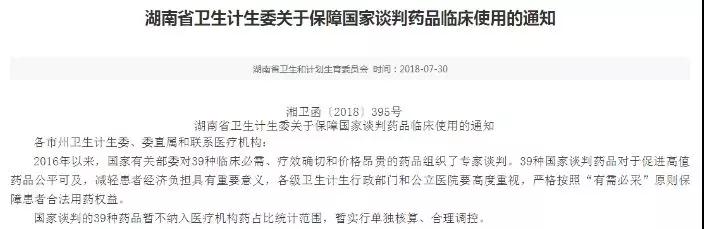 7月30日,湖南省卫计委发布两则通知:《湖南省卫生计生委关于进口抗癌药品重新申报挂网价格的通知》和《湖南省卫生计生委关于保障国家谈判药品临床使用的通知》。通知要求,在湖南省现行药品集中采购中中标的降税进口抗癌药品应重新申报挂网价格,价格下降金额不得少于降税金额;国家谈判的39种药品暂不纳入医疗机构药占比统计范围,暂实行单独核算、合理调控。