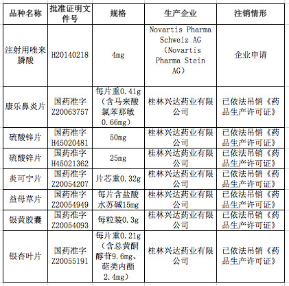 根据公告,有8个药品被注销批准文号。其中,桂林兴达药业有限公司的银杏叶片、康乐鼻炎片、益母草片等7个产品的批准文号,是由于已依法吊销《药品生产许可证》而被注销。