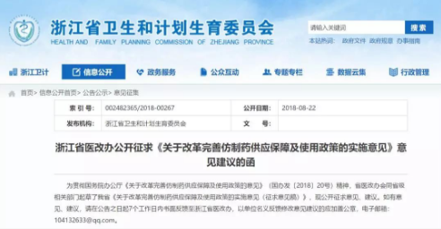 昨日(8月22日),浙江省卫计委发布关于浙江省医改办公开征求《关于改革完善仿制药供应保障及使用政策的实施意见》意见建议的函(以下简称《意见》)。