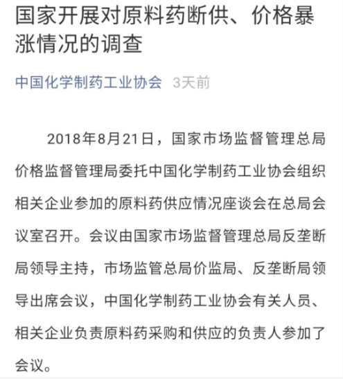 原料药价格暴涨,已被国家市场总局盯上了。