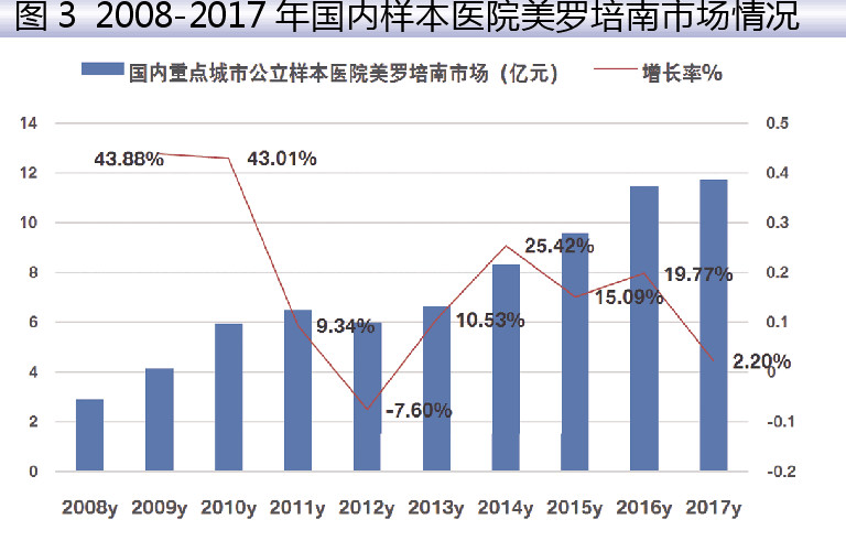 据米内网数据,2017年国内重点城市样本公立医院美罗培南用药金额为11.73亿元,增长率为2.20%,在国家“限抗令”和2017“抗管令”的制约下,2017年比2016年的19.77%增长率降低了近18个百分点。