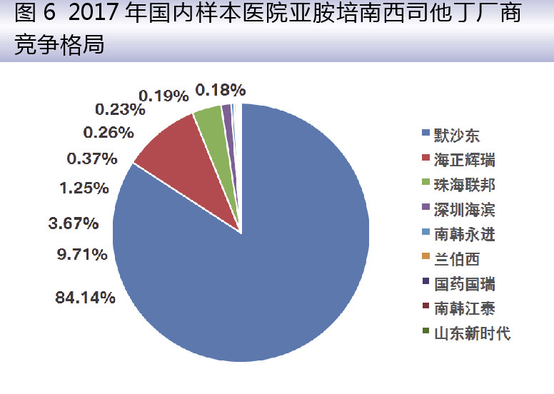 2017年国内重点城市公立医院亚胺培南西司他丁TOP5供应厂商中,默沙东的原研药“泰能”占84.14%,海正辉瑞占9.71%,珠海联邦占3.67%,深圳海滨占1.25%,南韩永进占0.37%,其他公司占0.86%。