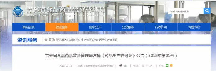 医药网9月21日讯 近日,吉林省食品药品监督管理局发布了注销《药品生产许可证》公告。