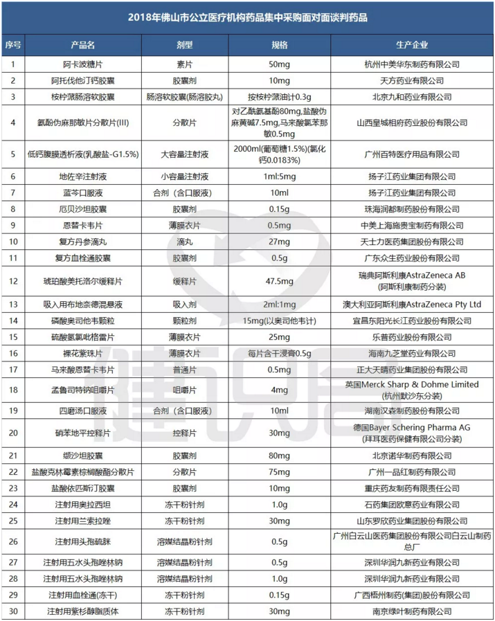 根据佛山市人社局9月21日发布的“公立医院集中药品采购议价方案”,该市将组织对6685个品规实行系统集中议价。同时对《佛山市议价药品目录》中“属佛山市2017年采购金额前50名且分组后为独家”的30个品规开展面对面议价。