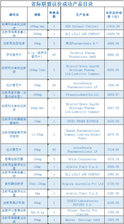 10月19日,陕西、内蒙古、宁夏、甘肃、青海、新疆、湖南、黑龙江、辽宁、广西、贵州、海南、山西、吉林14省药采平台同时发布《关于省际联盟进口抗癌药品联合议价结果的公示》。