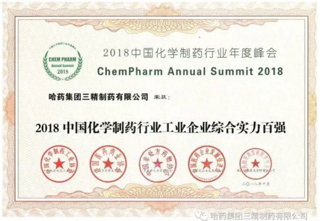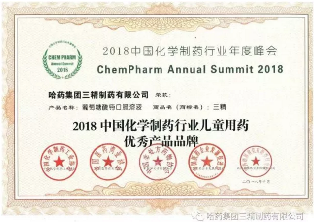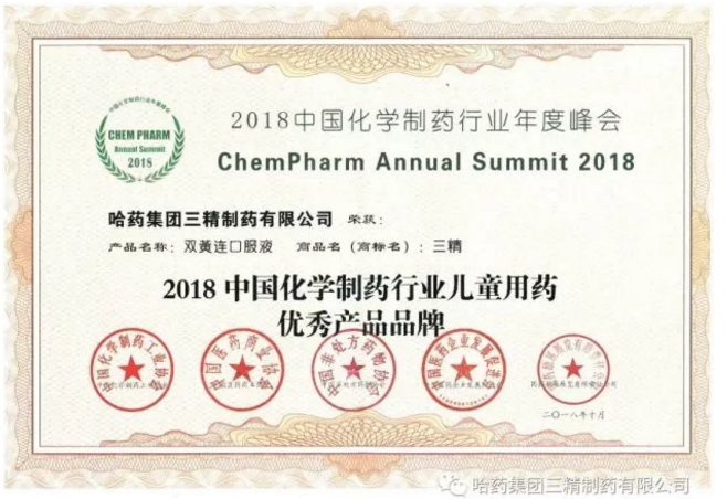 2018年10月16日,以"质量﹒诚信﹒品牌"为主题的“2018中国化学制药行业年度峰会”在江苏南京成功举办。会议期间进行了由中国化学制药工业协会、中国医药商业协会、中国非处方药物协会、中国医药企业发展促进会、国药励展展览有限责任公司共同组织并推荐的“2018中国化学制药行业优秀企业和优秀产品品牌”榜的发布活动及授牌仪式。