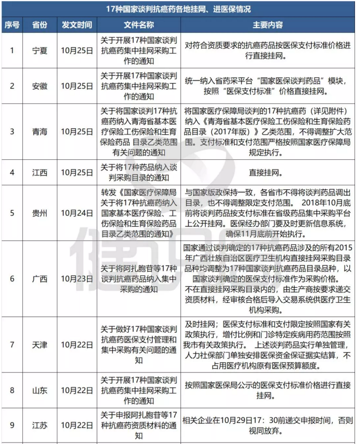 第二天(10月11日)即有2个省份——四川、湖南率先宣布相应产品挂网。据健识君不完全统计,截至目前,至少已有湖北、四川、浙江、黑龙江、福建、天津、贵州、广西、广州等21省(直辖市、自治区)、市落实相关品种开始挂网采购或明确报销比例。按照国家医保局的要求,患者11月底前逐步能买到降价后的抗癌药。