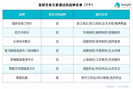 Insight 一致性评价数据库统计,截至10月底,289目录启动率为39.9%,通过的289品种19个。一致性评价品种通过企业达3家的品种已经有7个。