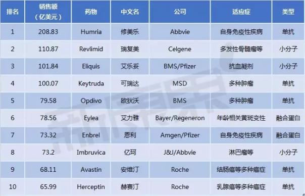 赫赛汀是一种靶向于人表皮生长因子受体(HER2)的人源化单克隆抗体。HER受体通过感受外界的信号刺激促进细胞的增殖,在相当一部分的癌细胞中HER2过表达导致细胞生长失控。赫赛汀早在1998年就被FDA批准上市,是最早的靶向治疗药物之一,目前已经是治疗HER2阳性弥散性乳腺癌的黄金标准,近期又被批准用于治疗HER2受体为阳性的转移性胃癌上。此药的专利已经在2015年到期,目前已经有四个生物类似药物上市:分别是辉瑞的Trazimera,Celltrion公司的Herzuma,Bioepis公司的Ontruzant、Mylan和Biocon的Ogivri,但是从近几个季度的销售额来看,赫赛汀似乎没有受到太大的影响,2018年Q3销售额达到16.35亿美元,较去年同期有所增长。这可能是两方面的因素,一方面赫赛汀早已畅销全球,这几种仿制药只是在局部地区获批上市,赫赛汀还占据着绝对的优势;另一方面生物类似药物和化学仿制药物还是有区别的,由于生物药结构更为复杂,类似药往往达不到原研药的药效,尽管如此,赫赛汀的市场受类似药慢慢蚕食已经是不可阻挡的趋势,明年或许是它最后一次排在TOP10榜单中,预测2019年销售额65.99亿美元。