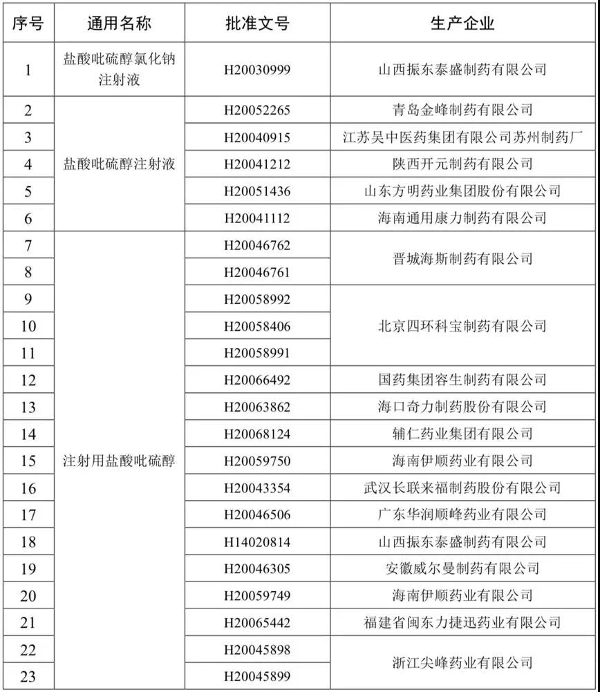在药监局发布的吡硫醇注射剂名单中,共有19家药企有相关批文,包括盐酸吡硫醇氯化钠注射液、盐酸吡硫醇注射液和注射用盐酸吡硫醇。