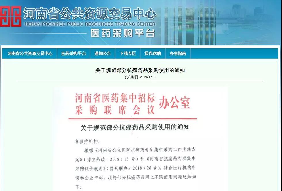 按照河南省早些时候下发的《关于执行抗癌药专项集中采购议价结果的通知》的要求,抗癌药专项集中采购中未入围议价结果且未列入限量挂网采购的药品,医院与2018年12月30日以前采购的可延续使用到2019年1月底,2月1日以后一律停止采购和使用。