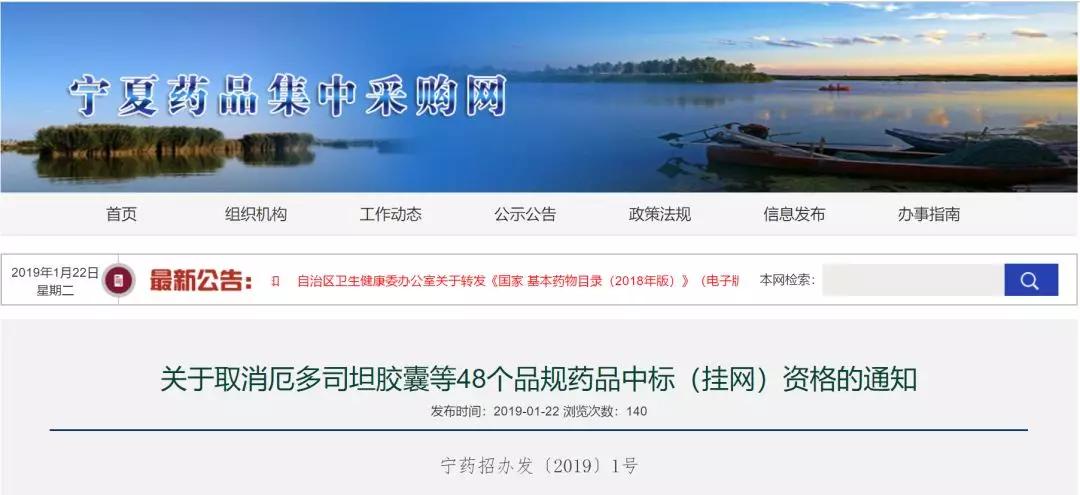 1月22日,宁夏药品集中采购网发布《关于取消厄多司坦胶囊等48个品规药品中标(挂网)资格的通知》,48个药品被取消挂网。