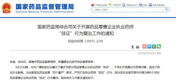 所有注册执业在药品零售企业的执业药师亦须一并开展自查,凡是存在“挂证”行为、不能在岗服务的执业药师,应立即改正或于2019年 4月30日前主动申请注销《执业药师注册证》。