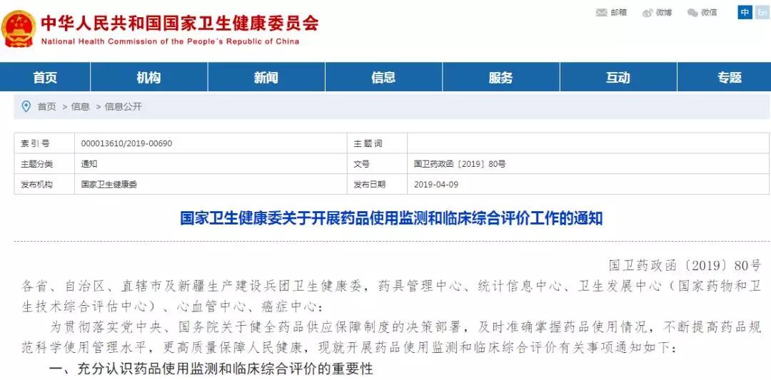 医药网4月10日讯 4月9日,国家卫健委官网发布《关于开展药品使用监测和临床综合评价工作的通知》(以下简称《通知》)要求,在全国各级公立医疗卫生机构中抽取不少于1500家机构,对药品使用与疾病防治、跟踪随访等相关数据进行重点监测。