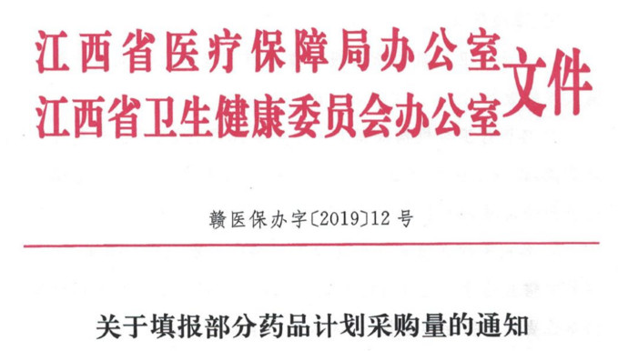 日前,据“医药代表”微信公众号透露,4月8日江西省医保局、卫健委联合发布《关于填报部分药品计划采购量的通知》。