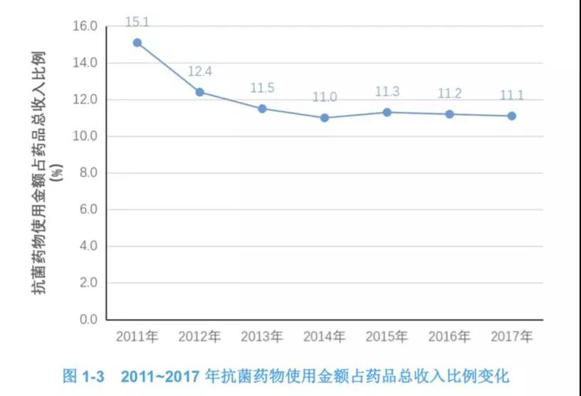 2011年以来,抗菌药物占药品总收入的比例总体呈下降趋势,从2011年的15.1%下降到 2017 年的11.1%。这一定程度上意味着,国家颁布的各种限抗令,经过时间的沉淀后,迎来了成效。