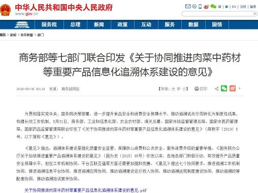 医药网6月14日讯 日前,商务部、国家市场监管总局、国家药品监管局等七部门联合印发《关于协同推进肉菜中药材等重要产品信息化追溯体系建设的意见》(以下简称《意见》),提出要推进七项工作的协同,以推动追溯试点示范转化为制度性成果,构建长效工作机制。