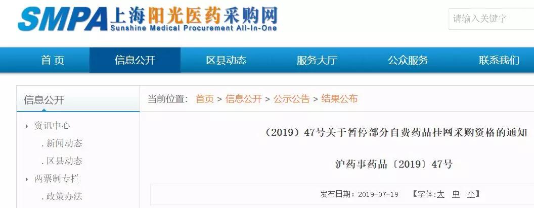 7月19日,上海阳光医药采购网发布《关于暂停部分自费药品挂网采购资格的通知》。