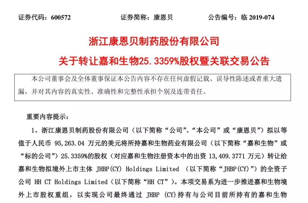 近日,浙江康恩贝股份有限公司(以下简称“康恩贝”)拟以人民币9.53亿将所持有的嘉和生物药业有限公司(以下简称“嘉和生物”)25.3359%的股权转让给嘉和生物拟境外上市主体JHBP(CY) Holdings Limited (以下简称“JHBP(CY)”)的全资子公司 HH CT Holdings Limited(以下简称“HHCT”)。
