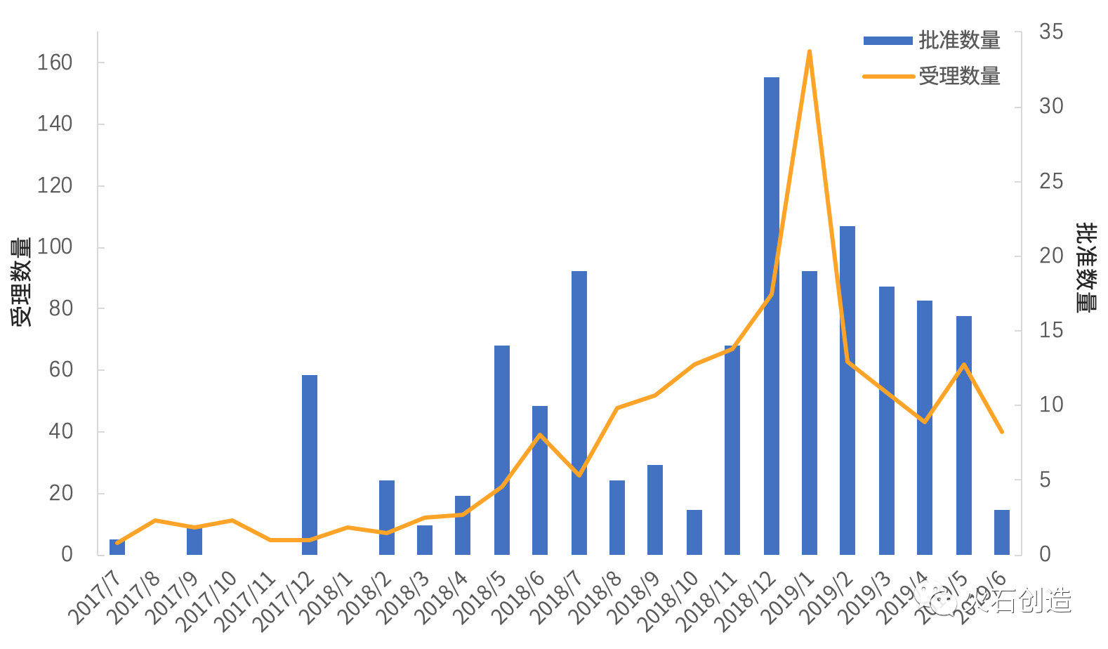 药品受理最多的月份是2019年1月(164个),1月之后受理量呈下降趋势。6月份受理药品数为40个,为2018年8月以来的最低值。